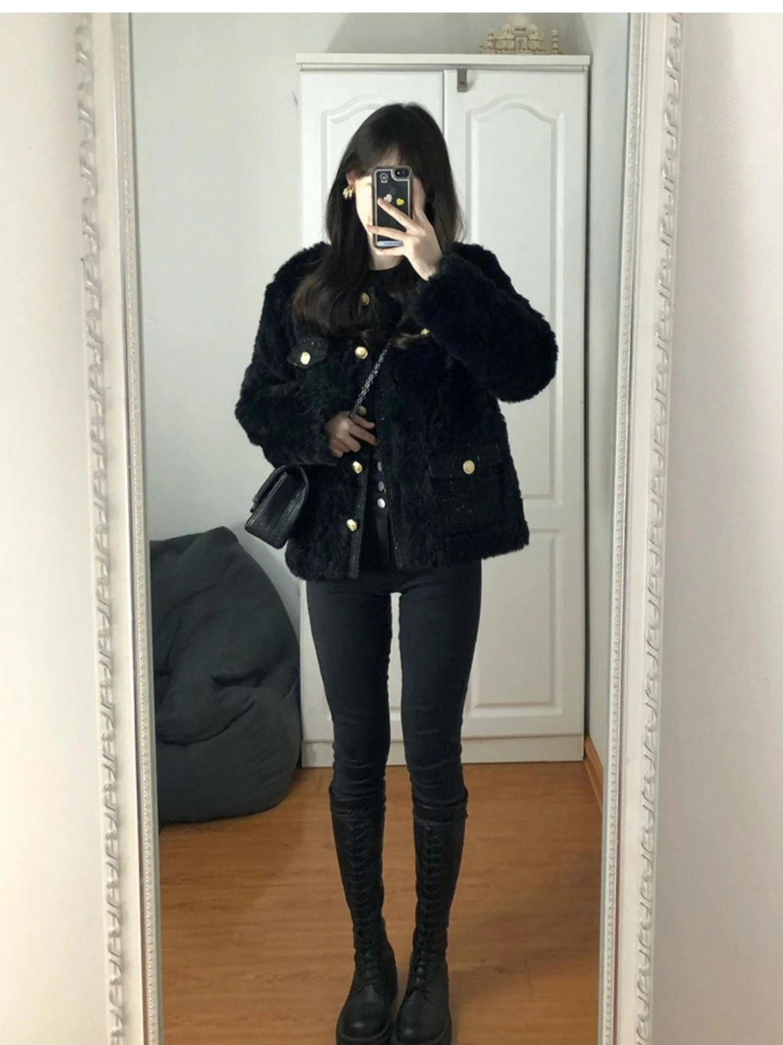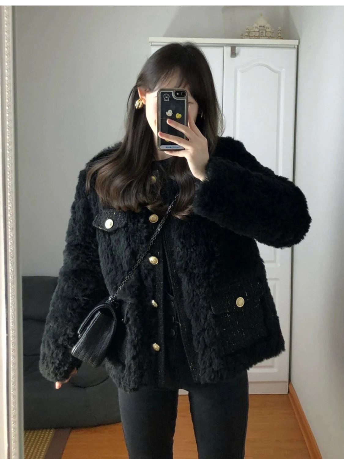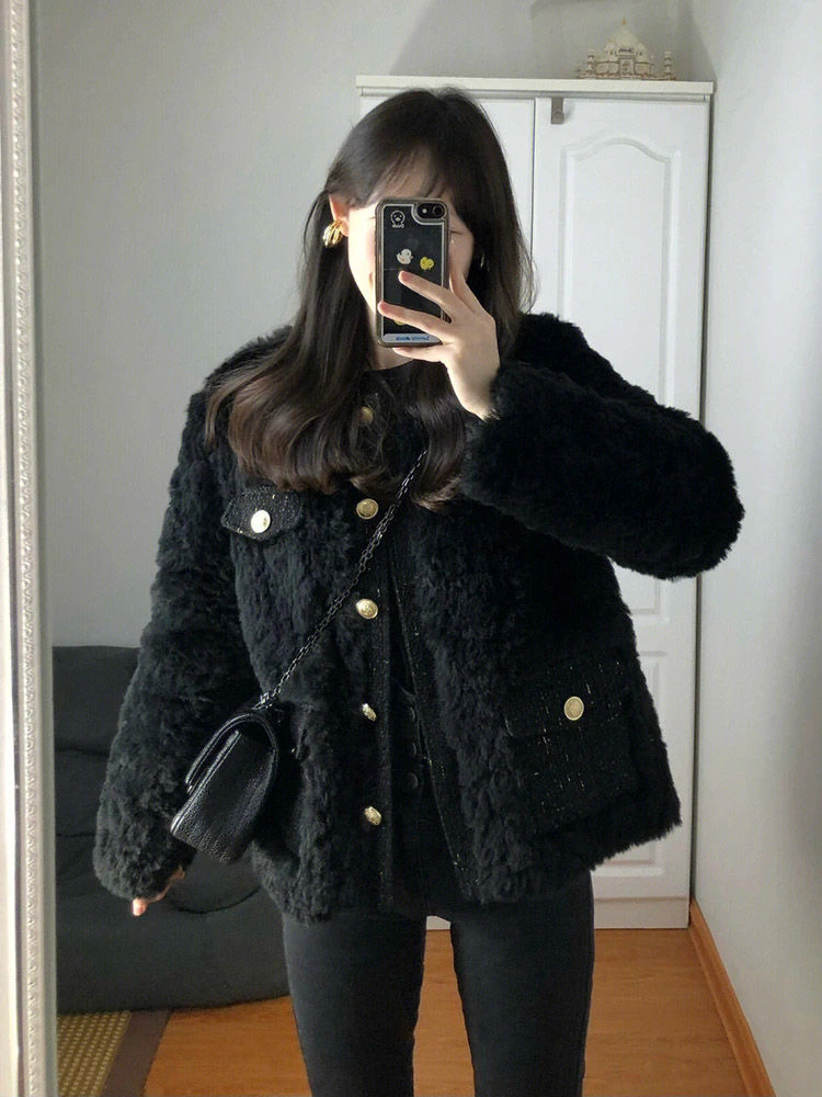 Bla Lamb Fur Jaet Women's 2025 New Winter Korean Sle Petite Ele Lady Cotton Clothes Button Thiened Long Sve